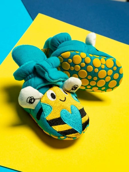 Almost as sweet as your little honey bee, these bee-utiful booties are designed to keep little feet as snug as a bug. All our booties come with an elasticated cuff and soft rounded edge velcro for easy dressing. They’re fleecy inside for comfort and warmth, with a printed all over pattern on the sole. Compostion:100% polyester fleece lining, 100% cotton outer fabric. Colour: Teal/Yellow/Black