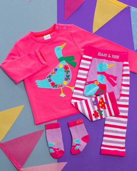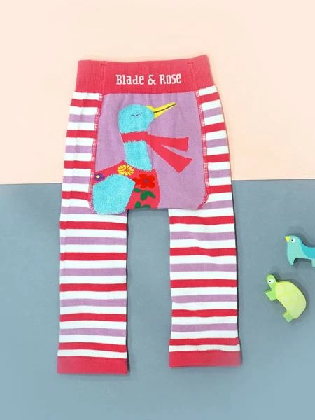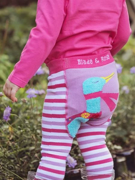 There’s no doubting it, Casey the Goose is ready to explore. This delightful design is made for the independent little one in your life. The leggings come in a lovely lilac, pink and white stripe, with a fluffy Casey on the bottom. They’re perfect for a wander. Our leggings are stretchy and seamless to enable total freedom when playing and have a lovely wide, ribbed waistband for comfort. The bottom is designed to stretch around nappies, including cloth ones. Compositon : 75% Cotton/ 20% Nylon/ 5% Spandex Colour: Pink/White/Lilac