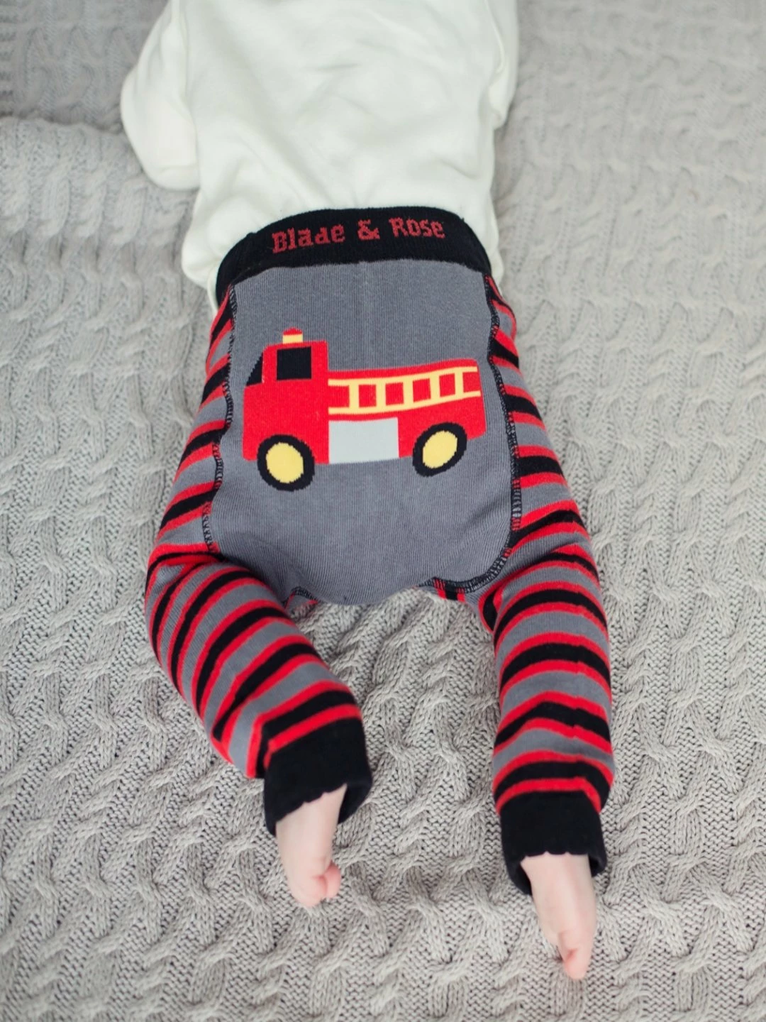 Cool and funky these bright multi coloured striped leggings have a fire truck on the bum. Blade & Rose is a leading British children’s clothing brand specialising in a trendsetting range of leggings and clothing accessories. Blade & Rose was created in 2010 whilst designer Amanda was on maternity leave. Which ultimately led the company to be named after her childrens middle name ‘Blade’ and ‘Rose’. Each piece of the collection is unique and has the trademark design on the bum. A major component of the development was to ensure that the quality of the fabric was durable, functional, would wash well and most importantly, that was soft and kind to children’s delicate skin. The initial range quickly sold out and now the British family business has stockists all over the world including Germany, Switzerland, France, Spain, Belgium, Italy, Netherlands, Greece, Japan, China, Taiwan, UAE, New Zealand and Australia & is now extensively rolling out in the USA. Blade & Rose will continue to extend the clothing range with matching accessories and new designs.