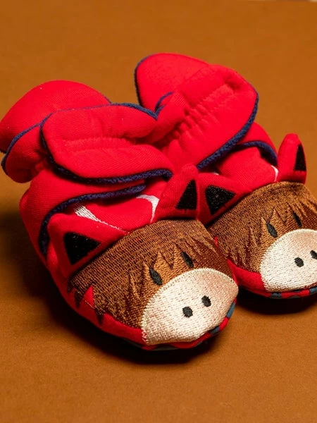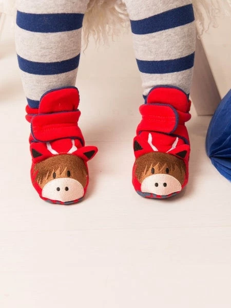 Made for moving and grooving around the house, it’s our handsome Highland Cow. Who can resist a little tickle behind those 3d ears? All our booties come with an elasticated cuff and soft rounded edge velcro for easy dressing. They’re fleecy inside for comfort and warmth, with a printed all over pattern on the sole. Compostion:100% polyester fleece lining, 100% cotton outer fabric. Colour: Red/Brown