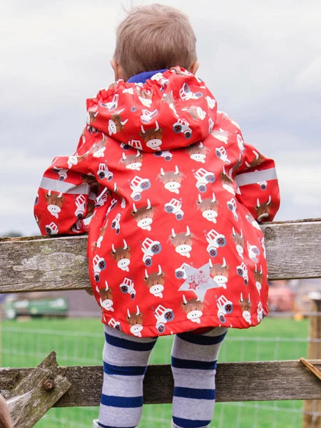 This cheery red coat with our cheeky Highland cow all over it is a must for any little explorer. With colour changing cows and tractors it will be a instant hit with your tiny explorer. Outer layer is made from 100% recycled polyester. Recycled polyester (often called rPet) is made from recycled plastic bottles. Fully lined in contrasting colour Bright zip and poppers Elasticated hood and cuffs Reflective strips on arms and back hem Name label on the inside Hook for handy hanging Dipped hem at the back to keep bottoms warm and dry Waterproof rating of 3000 mm – Colour: Red/Brown/Blue