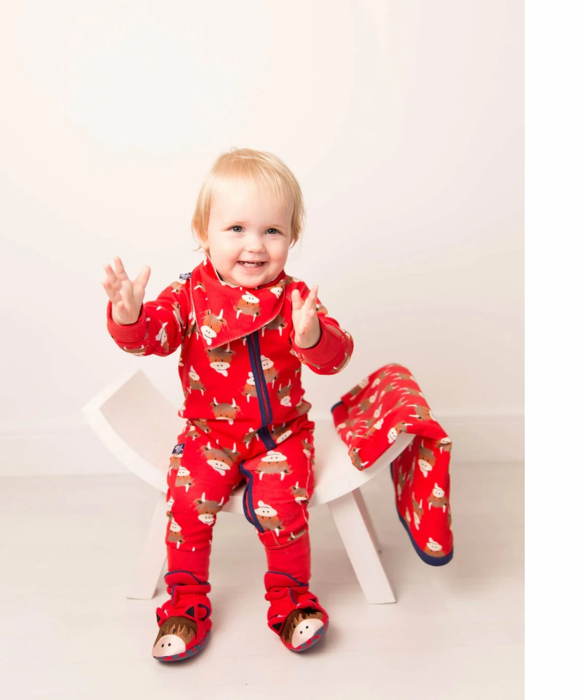Our cheerful Highland Cow romper is destined to delight both adults and kids alike. The bright red background is printed with our ever popular cheeky cow face, and is a must for any lover of the farm. All of our super soft rompers come with a contrasting, vertical two way zip to make dressing and nappy changing easier. The zips have a small pocket at the neck for comfort. They also have fold-able cuffs on the sleeves and feet, meaning you can tuck little hands and feet in and help keep them warm. Composition: 100% Cotton