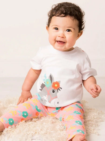 In summer perfect pink, with bright pops of colourful flowers and Mika on the bottom, these leggings are just the ticket for your little foal. Our summer leggings are made from lightweight, soft cotton and feature a stretchy waistband. They feature all over print with an applique design on the bottom. We ensure our cotton supply and factories are sustainable find out more see our factories page Composition – 57% Cotton, 38% Polyester 5% Elastane