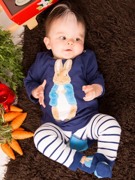 This classic Peter Rabbit, wearing his smart blue jacket, has been given a modern twist with a fluffy finish. The deep navy background shows Peters blue jacket off to perfection. Our tops are made from brushed cotton to make them extra soft on your child’s skin, with a contrasting inner cuff for when they want to roll their sleeves up. Featuring contrasting poppers to make getting dressed easier, the neck line is specially designed to stop irritation. Composition : 95% Cotton/ 5% Elastane