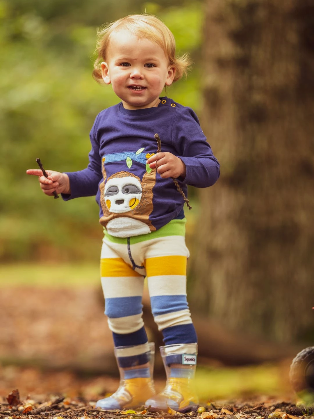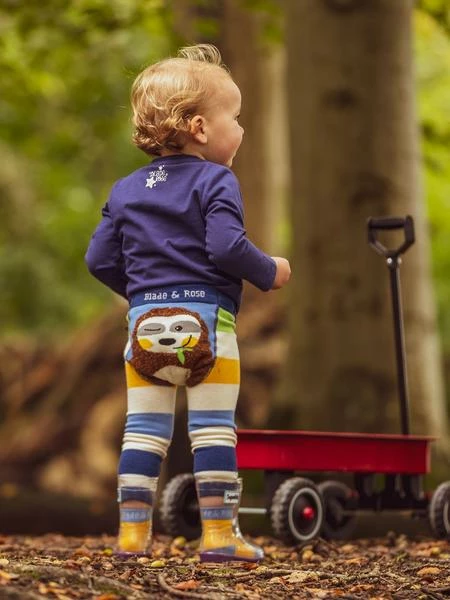 Made for those slower, hanging around the house days, it’s Silas the Sloth. Chunky multicoloured stripes and a fluffy Silas on the bottom. These leggings are stretchy and seamless to enable total freedom when playing and have a lovely wide, ribbed waistband for comfort. The bottom is designed to stretch around nappies, including cloth ones. Compositon : 75% Cotton/ 20% Nylon/ 5% Elastic Colour: Cream/Blue/Yellow