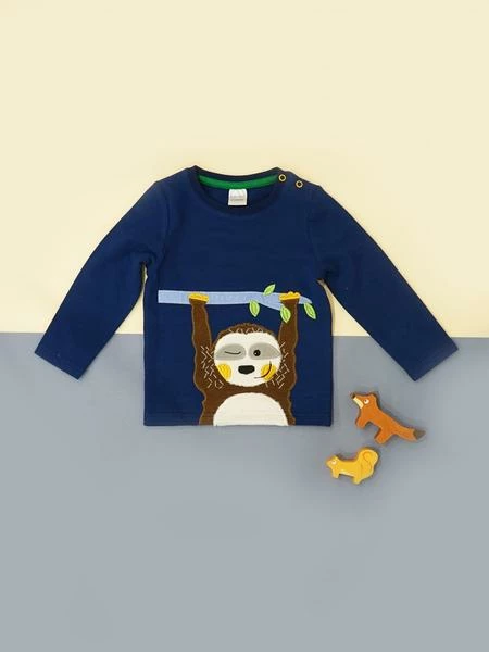 What a cheeky chappy Silas is, swinging around without a care in the world. Navy long-sleeved tee with applique and embroidered details. Our tops are made from brushed cotton to make them extra soft on your child’s skin, with a contrasting inner cuff for when they want to roll their sleeves up. Featuring contrasting poppers to make getting dressed easier, the neckline is specially designed to stop irritation. Composition : 95% Cotton/ 5% Elastic Colour: Blue