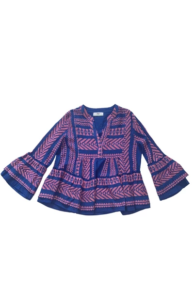 Beautifully embroidered using coloured cotton, a lightweight burst of colour for your summer wardrobe. Narrow mandarin collar with front V neckline placket and single press stud fastening 3/4 length sleeves with flared tiered cuffs Ruched detailing under bust and across the back Tiered gathered panel peplem body A-line relaxed silhouette Made from 100% Cotton Machine wash cold, do not dry clean