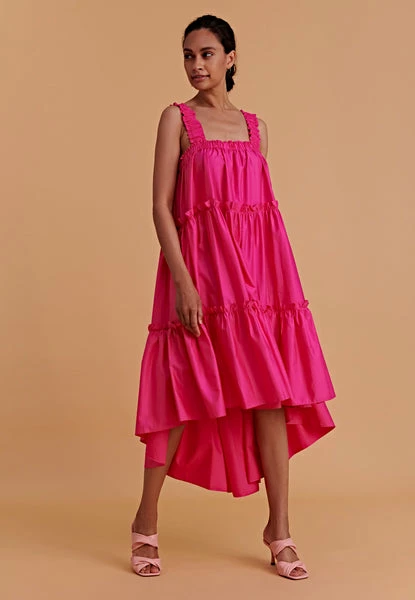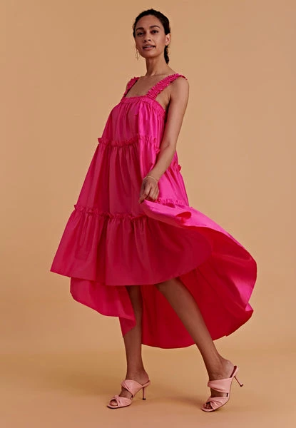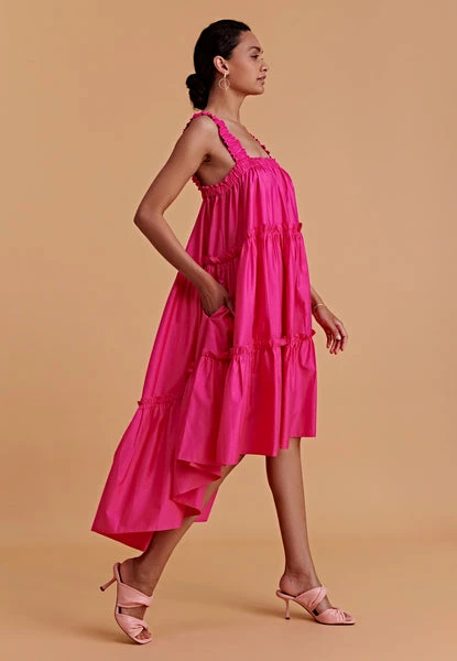 100% Cotton Dress with elasticated straps, longer at the back with a tiered ruffled edge skirt. One Size