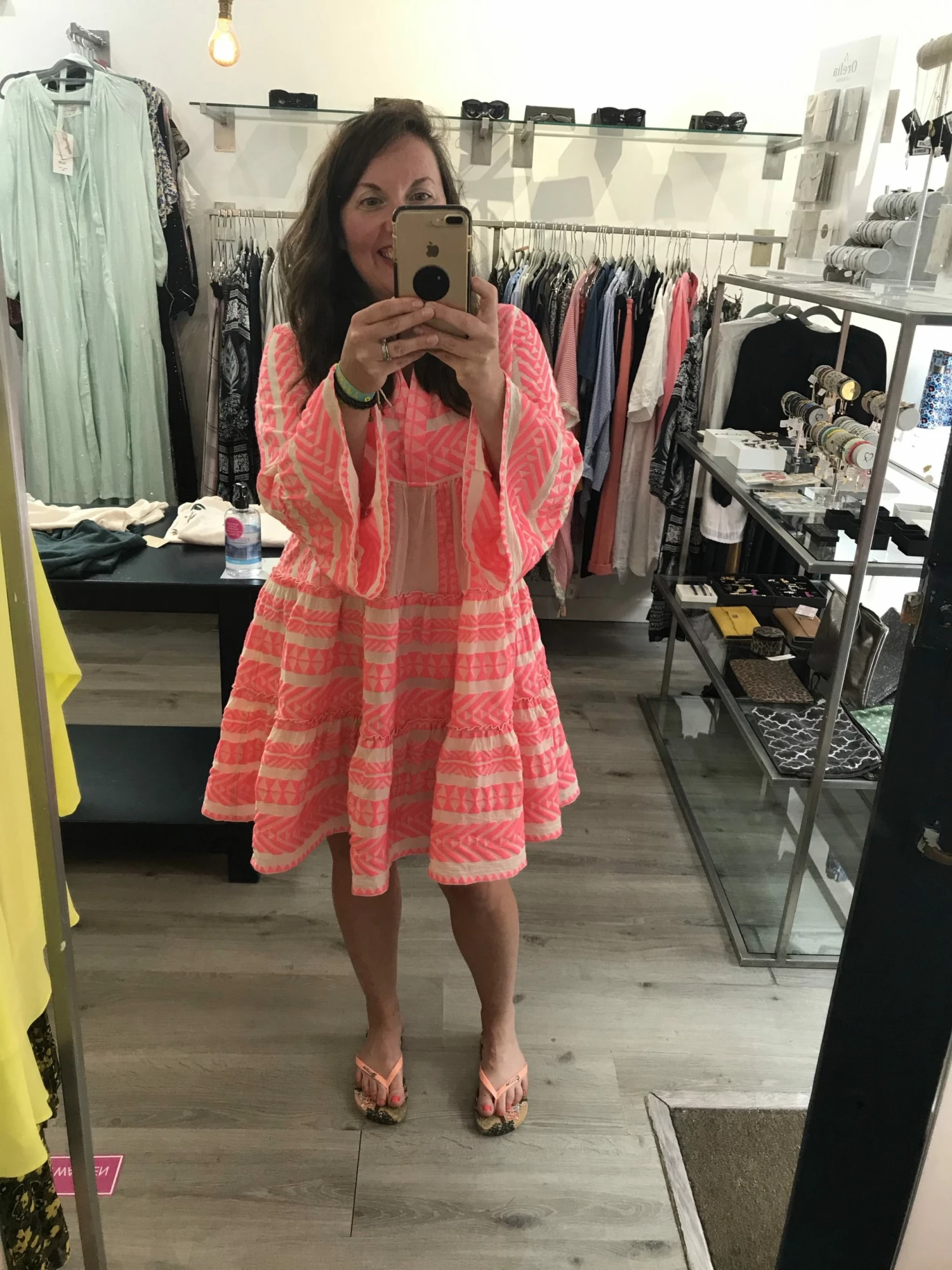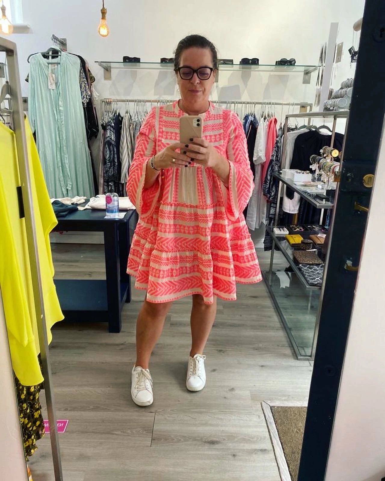 For an effortless summer look choose the Ella Mini Dress from resortwear designer Devotion. The bohemian inspired off white smock style dress is crafted in cotton with neon pink Aztec embroidery. Complete with a V notch neckline, cropped sleeves with fluted cuffs and a flared tiered skirt. The perfect addition to your summer wardrobe. Measurements- 34″ from shoulder to hem. Designed to be oversized, if you prefer a slimmer fitting dress – try a size down. 100% cotton. Smock style. 3/4 length sleeves. Embroidered design. Above-knee length. Devotion is a proud slow fashion brand founded by Athina Parnasa whose commitment to sustainability is a fundamental part of the brand’s ethos. Devotions signature silhouettes are truly unique and designed to defy season or trend.