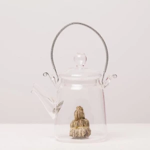 The flowering tea collection lets you enjoy our hand sewn flowering teas in style. A beautifully delicate glass teapot. Featuring a metal infuser in the spout, perfect for flowering teas and large leaf loose teas. 10 pieces rose flower blossom tea is made from green tea and rose petals, which are sewn and crafted together. When steeped in hot water, they unfurl to produce the most fascinating formations.