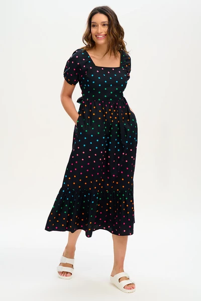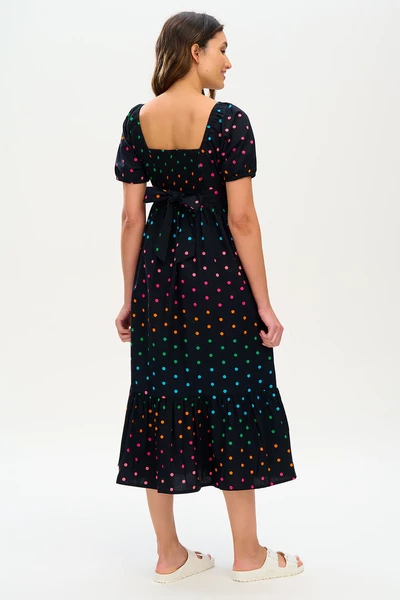 This Betsy Midi Smock style is a perfect everyday dress but can also easily be dressed up for Summer occasions. It includes a loose fit, it has a square neckline, a fitted bodice, sweet blouson sleeves, and an on-trend tiered skirt. The rainbow polka dot brings vibrance to your outfit of the day.