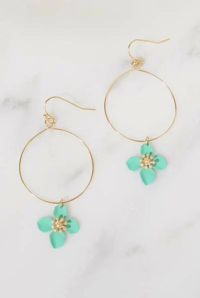 Mint floral hoop earrings in Gold Dimensions: Drop: 5cm Width: 3cm Nickel-free and hypoallergenic Light-weight to wear All earrings are non-refundable for hygiene reasons.