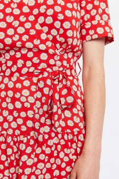 This tiered midi-dress from Louche is covered in a daisy print on a red, full polyester base. Featuring a V-neck line and a self-adjusting waist belt, this dress is perfect for any upcoming summer event or for helping you look good in everyday activities. Product Information: – %100 Polyester