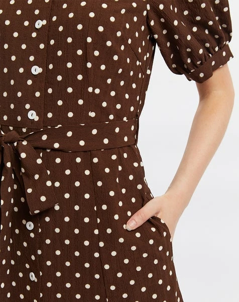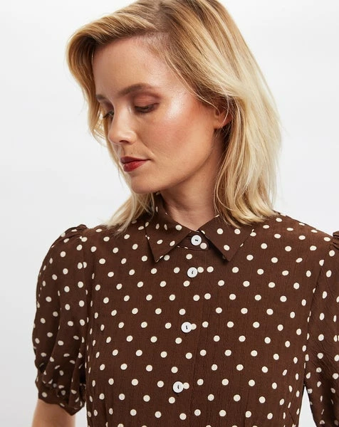 This reimagined midi shirt dress made with a dotty, pretty woman print on a smooth, heavyweight textured polyester. Featuring puff sleeves, front skirt slits and a self adjusting belt. Product information: 100% Heavy Weight Textured Polyester Turn inside out. Machine wash in warm water with similar colours. Do not bleach. Do not tumble dry, Simply hang on a hanger to dry. Cool iron. Do not dry clean.